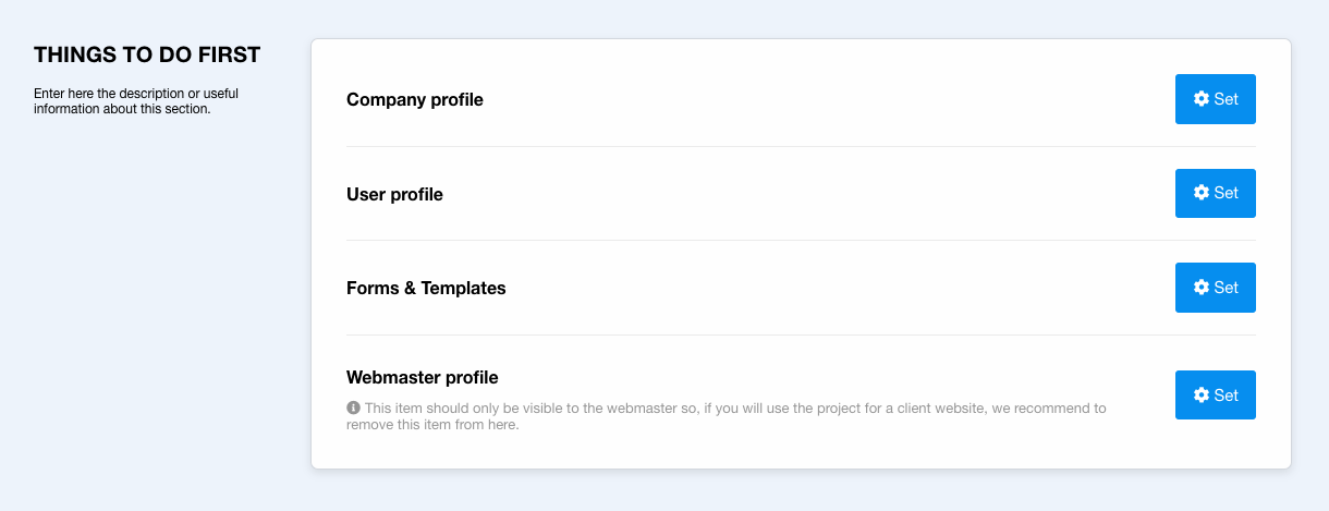 With the same concept as the front pages, the structure of the pre-built pages on the admin-side looks like this: