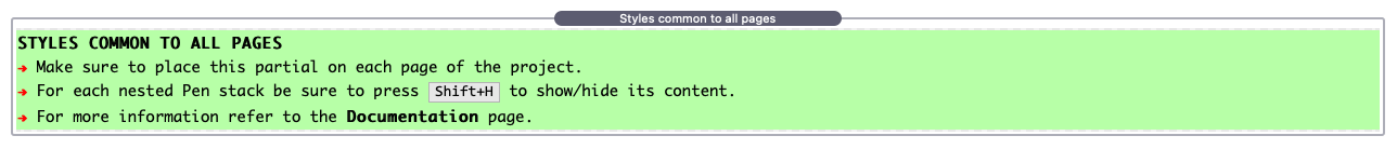 This section explains how the STYLES COMMON TO ALL PAGES partial is structured so as to understand its logic and be able to better manage all styles. When you open the partial you will find the following Pen stacks inside it which represent the main types of styles of the project: