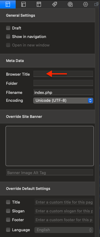 Select General Settings in the Inspector panel and enter the page title in the Browser Title field.