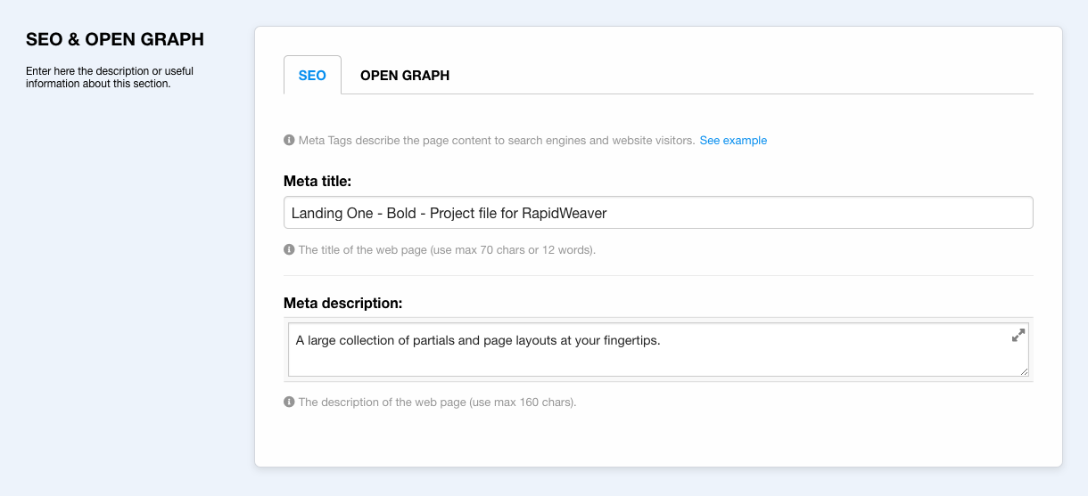 The SEO contents you can manage in the Total version of the project file are the same as in the Basic version, but you can do it directly in the admin side, so you don't have to open RW to change these contents.