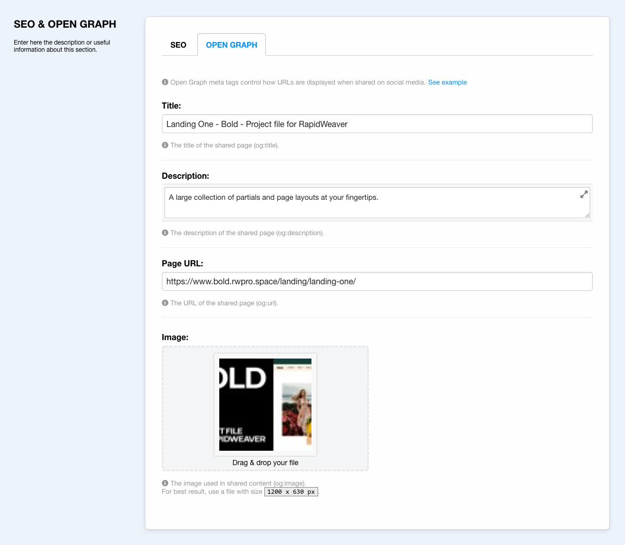 You will find the SEO & Open Graph section at the bottom of each page in the admin side.