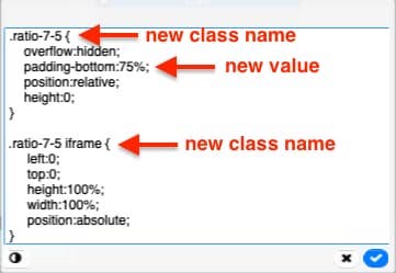 padding-bottom attribute that determines the height of the map based on its width (which is 100%). So just change this value to change the aspect ratio of the map/video.padding-bottom attribute with the new one 71.42 as shown in the screenshot below.ratio-7-5 class name to the 1 Column stack.